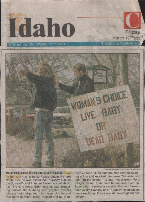 Since a pro-choice position is death, the guy who came out to make me take the poster down didn't like to see what he was for. He didn't accomplish what he wanted to do either. The article said that he punched me and knocked me down. That wasn't true! Of course when you do what I do then you get use to reading a lot of false stories about yourself. The newspaper is mostly liberal, they don't have problems with abortions, killing innocent life in the womb. If the guy did knock me down I am sure that he would have taken my posters which he didn't. He DID swing at me, I blocked it and down we both went to the ground. I held him in a bear hug until another guy pulled him up and got into our argument too. He told the guy that I wasn't doing anything wrong and to leave. The guy leaves since he learns the cops are coming. You will notice the poster that was put in the paper, the reporter didn't want to put the picture of the baby's head that the guy wanted to take from me for some strange reason? I guess that he doesn't want women to see what they are doing to their babies. Of couse, deep down I think they know anyway. |